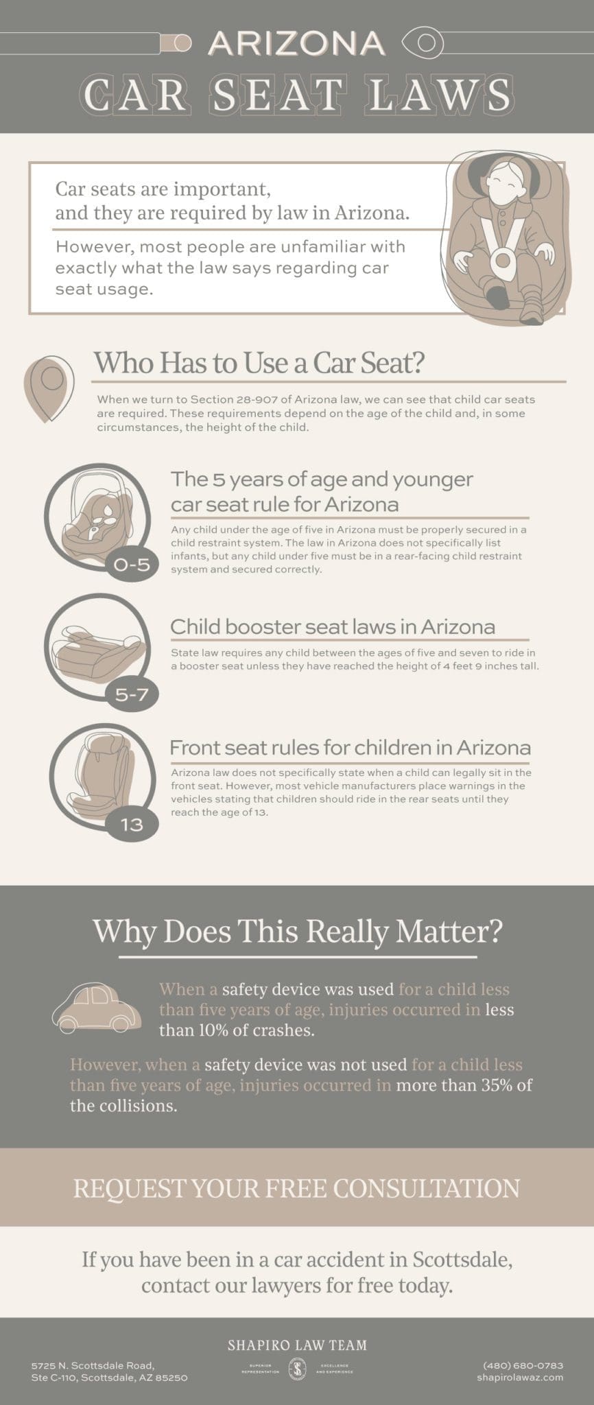 When we turn to Section 28-907 of Arizona law, we can see that child car seats are required. These requirements depend on the age of the child and, in some circumstances, the height of the child.