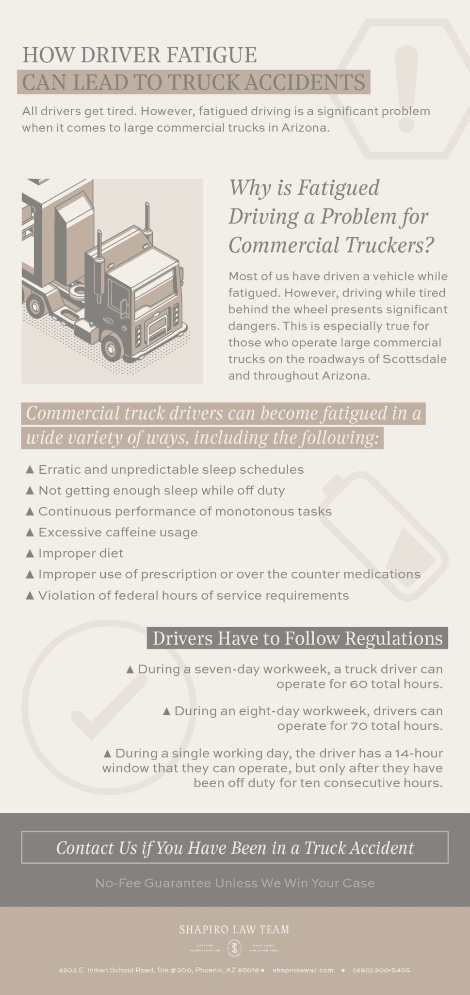 If a driver fails to follow the hours of service requirements set forth by federal and state regulators, this can lead to severe accidents. A truck accident lawyer in Scottsdale and Phoenix may need to get involved if you think that you have been injured in a truck accident caused by a fatigued driver. Contact Shapiro Law Team for more details!