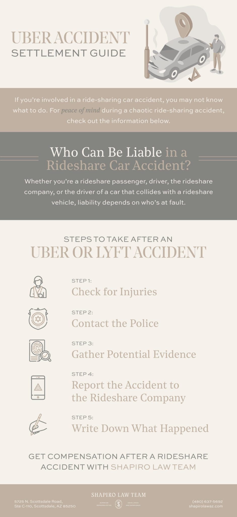If you’re a victim of a ride-share accident, you need to gather enough information to hold the liable party responsible for wrongdoing. Accomplishing this while recovering from your injuries is extremely difficult. Don’t waste another moment fighting this battle alone. Get in touch with a Phoenix personal injury lawyer from Shapiro Law Team. We have experience in ride-share accidents and deal with Uber and Lyft’s tricky insurance policies.