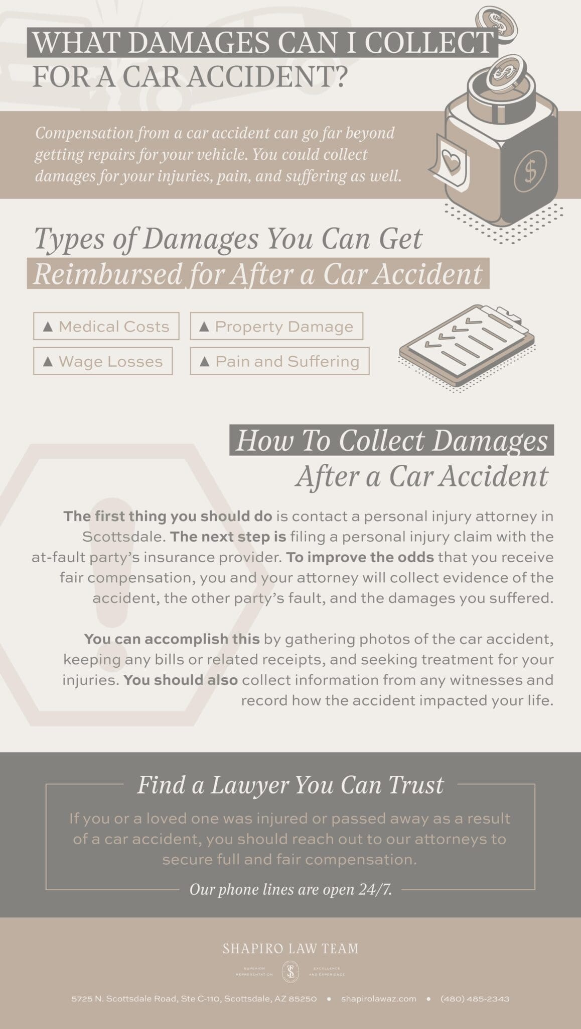 One minute you’re commuting to or from the office, then suddenly your car gets rear-ended. This scenario happens to countless people around Arizona daily, yet not everyone involved in an accident knows what kind of damage they can collect. Compensation from a car accident can go far beyond getting repairs for your vehicle. You could collect damages for your injuries, pain, and suffering as well. This article will detail all the ways you can secure compensation for your car accident.