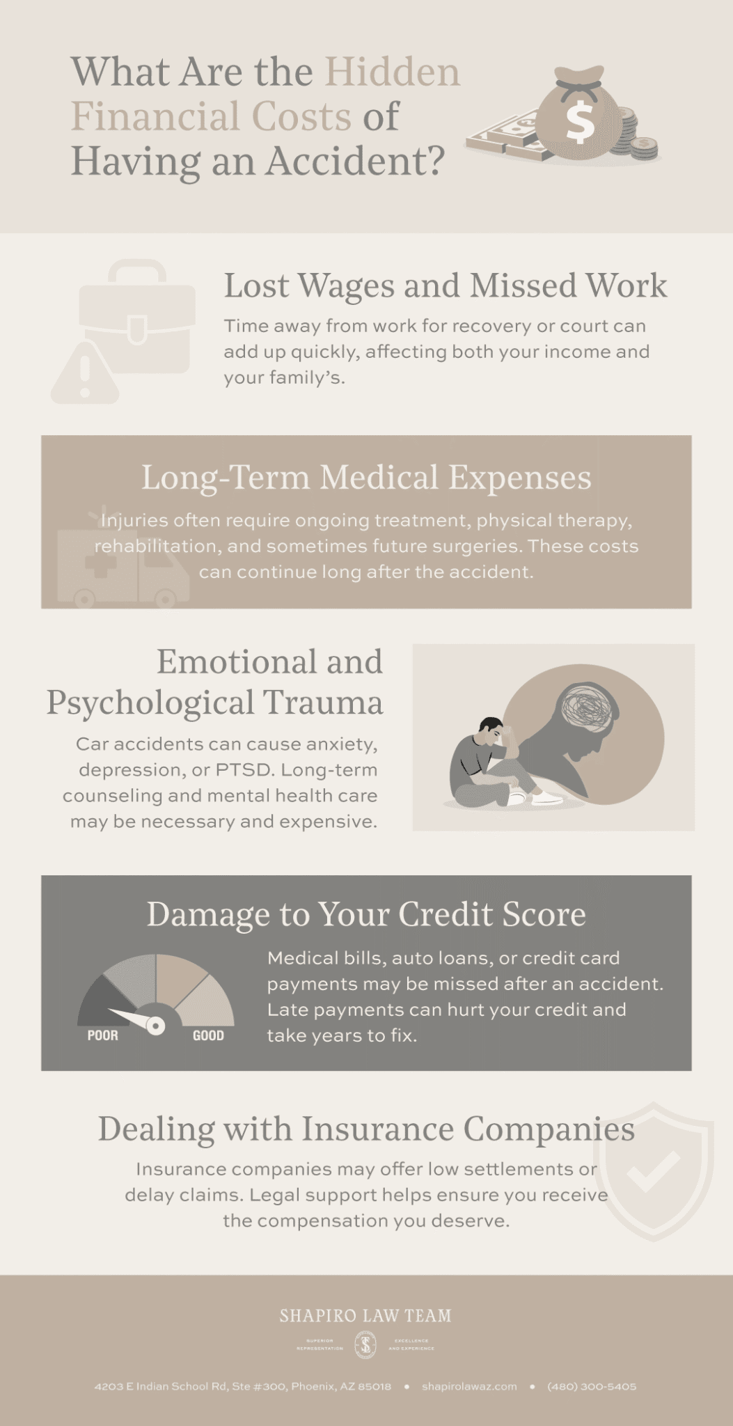The best step you can take following a car accident is to contact an experienced car accident attorney. Shapiro Law Team is well-versed in navigating the legal complexities of car crashes in Phoenix. Our team can also help you secure compensation that will cover the hidden costs of a collision.
